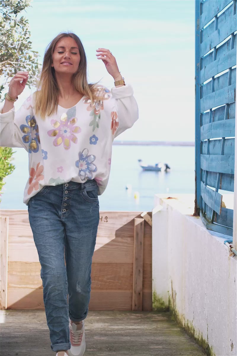 – Ecru jersey jumper with daisy motif in blue and orange pastel tones with a metallic touch.