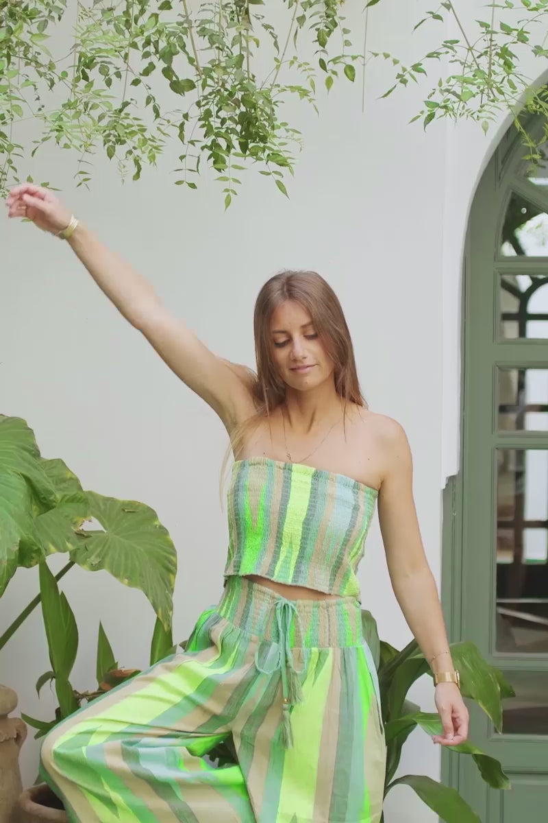 - Turn heads by the pool or at the beach, our Green Batik Tropical Stripe 2-Piece Lounge Set.