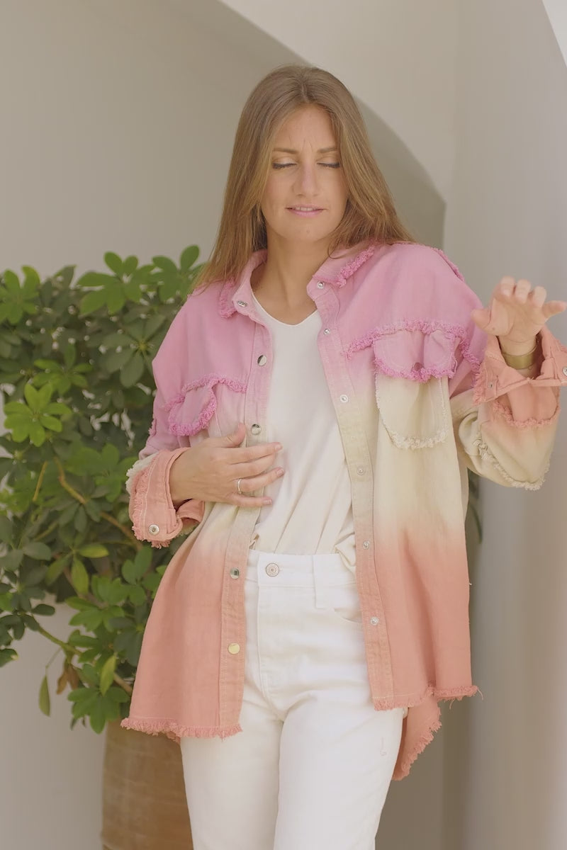 - Ombre pink, taupe and coral motif, frayed reverse seams and snap buttons.