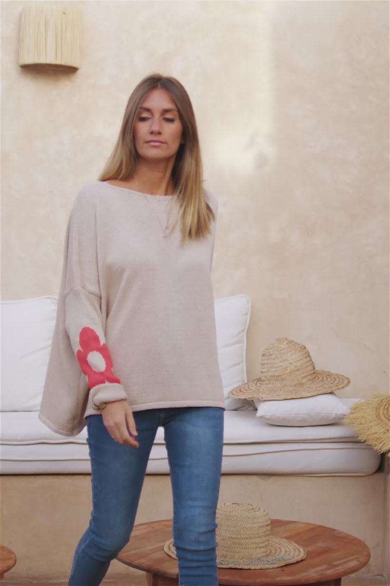 – Beige cotton knit sweater with large colourful flowers.