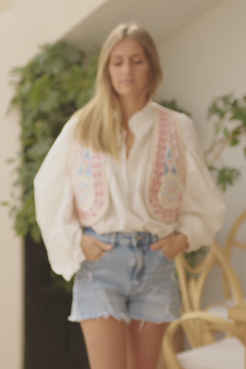 – Beige light denim gilet in with pink and floral embroidery with sequins.
