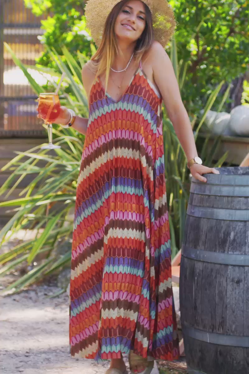 - Floaty metallic maxi dress with colorful chevron print.