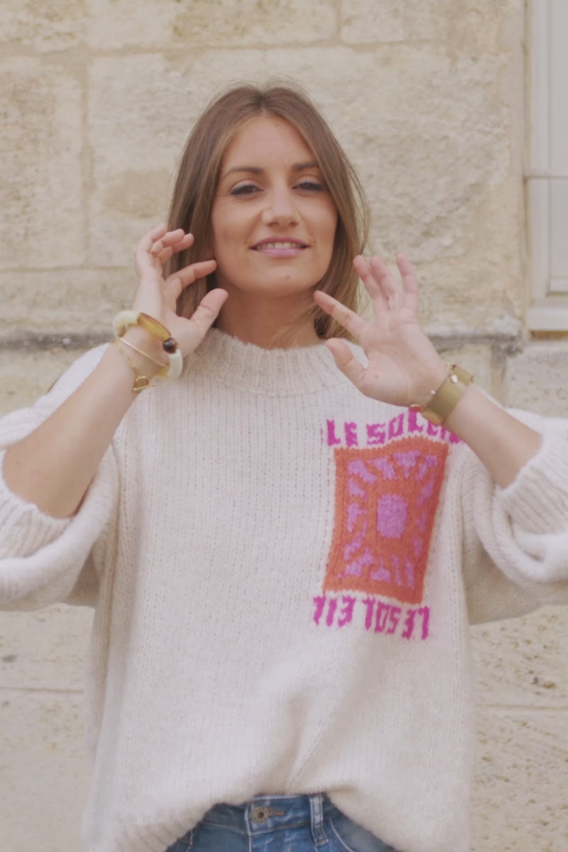 - Loose beige chunky knit sweater adorned with a pink and orange sun pattern and a mirrored 'Le soleil' (the sun) inscription on the chest and back.