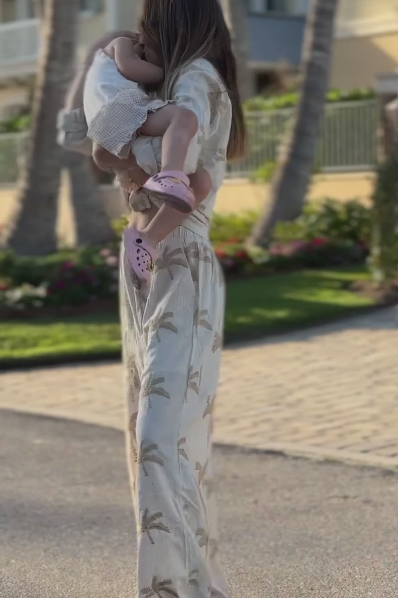 - Make tropical luxe your new go-to look in our Beige Linen Embroidered Palm Wide Leg Pants.