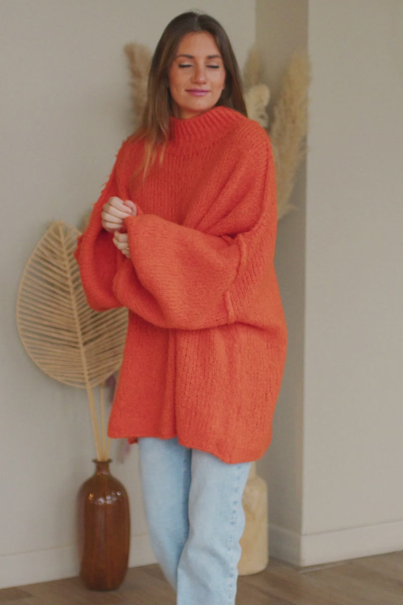 Orange Chunky Knit Sweater Oversized and Funnel Neck