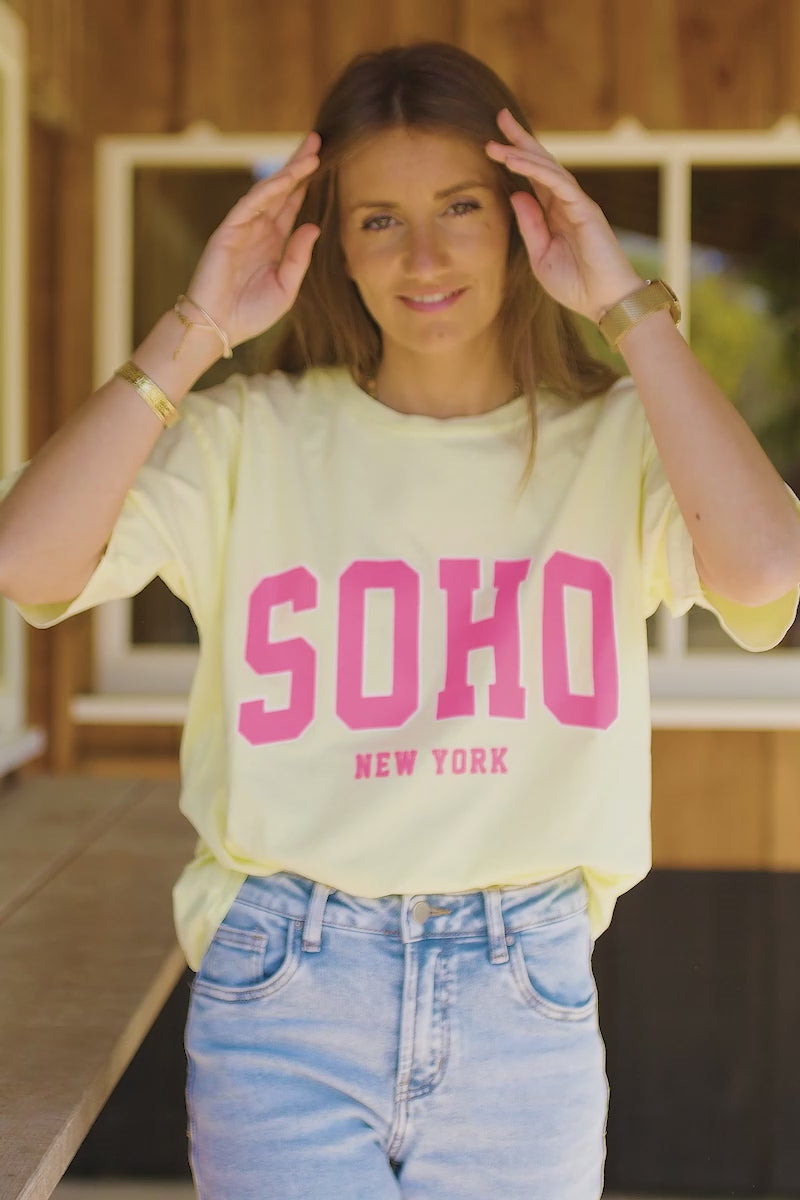 - Downtown or uptown, you’ll look casually chic in our Pastel Yellow SOHO New York Varsity Tee.
