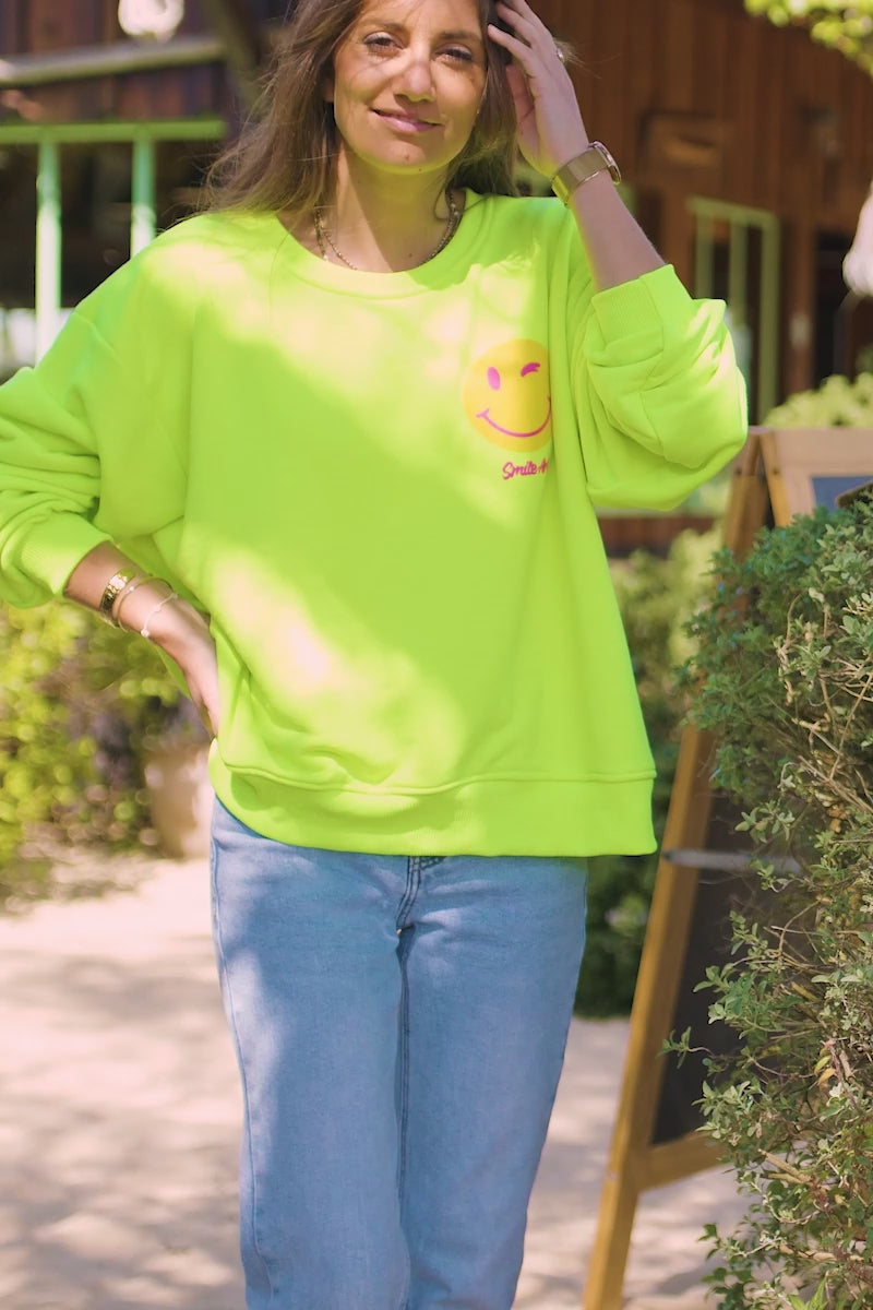 - Don’t ask why, just go with the flow in our Neon Yellow “WHY NOT” Smiley Screen Print Sweater.