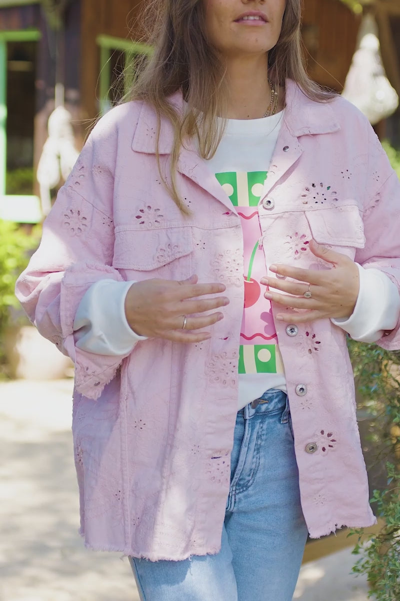 - Screen print cherry with pink square and green plaid picnic motif on front.Round neck, long sleeves, ribbed cuffs and hem and oversized fit complete the look.