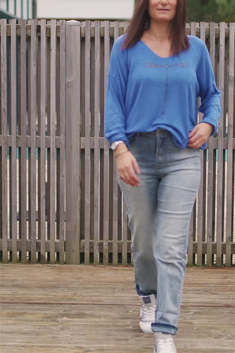 – Royal blue V-neck sweater with a glitter dragon fly on the chest.