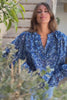 Blouse en coton bleu imprimé fleurs col v petits volants