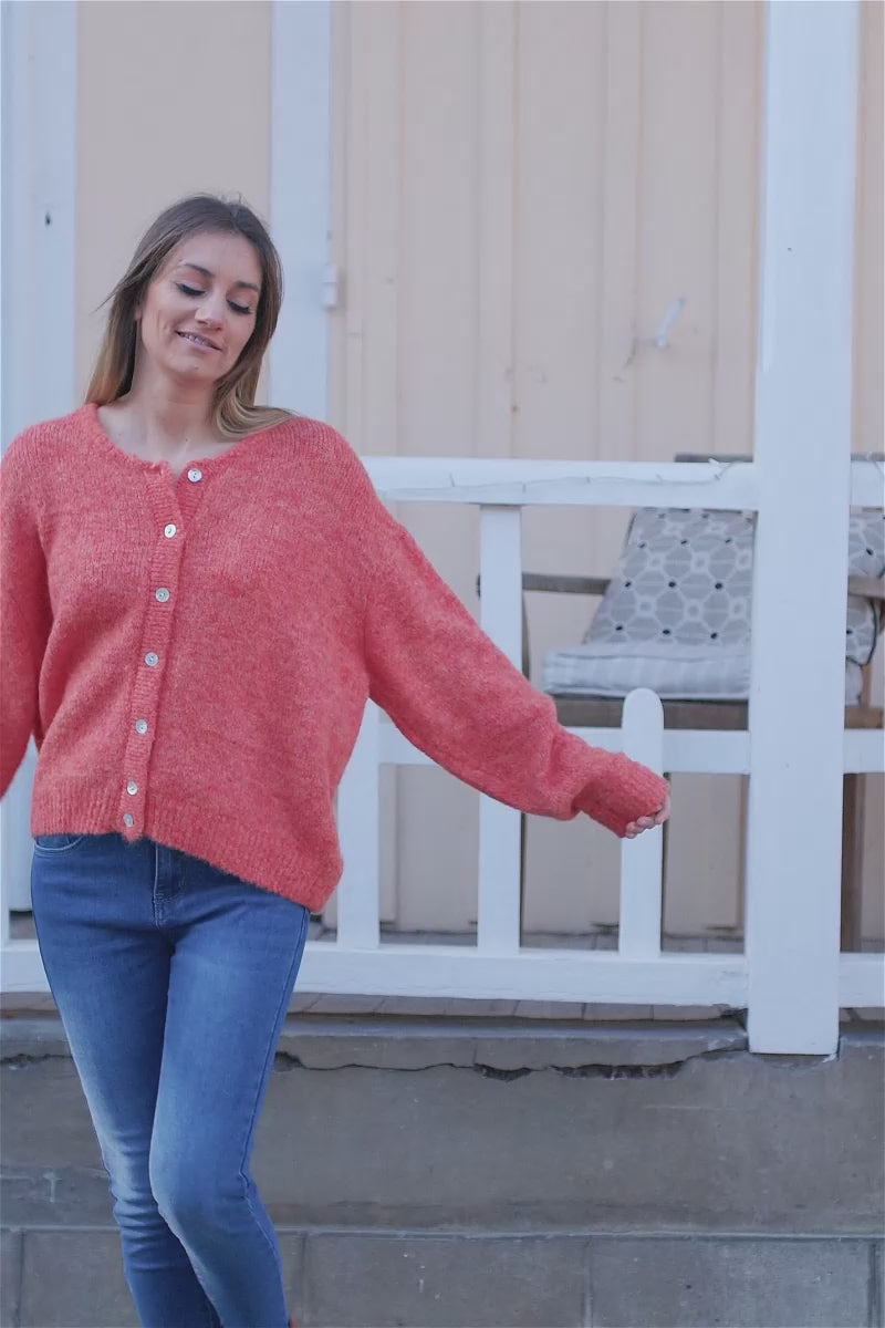 Acogedor cárdigan de punto de color naranja sangre con cuello redondo y botones de perlas