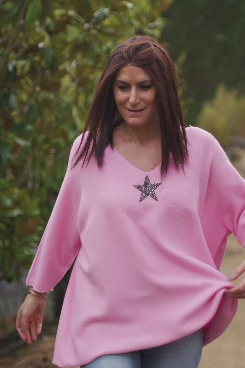 Jersey ancho muy suave rosa pastel con mangas murciélago de estrellas de strass