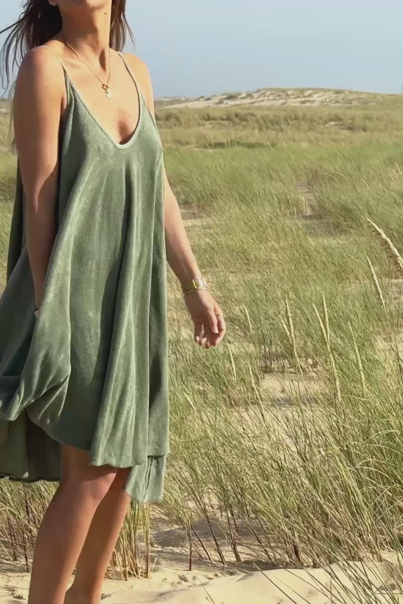 Vestido de rizo suave color caqui con tirantes
