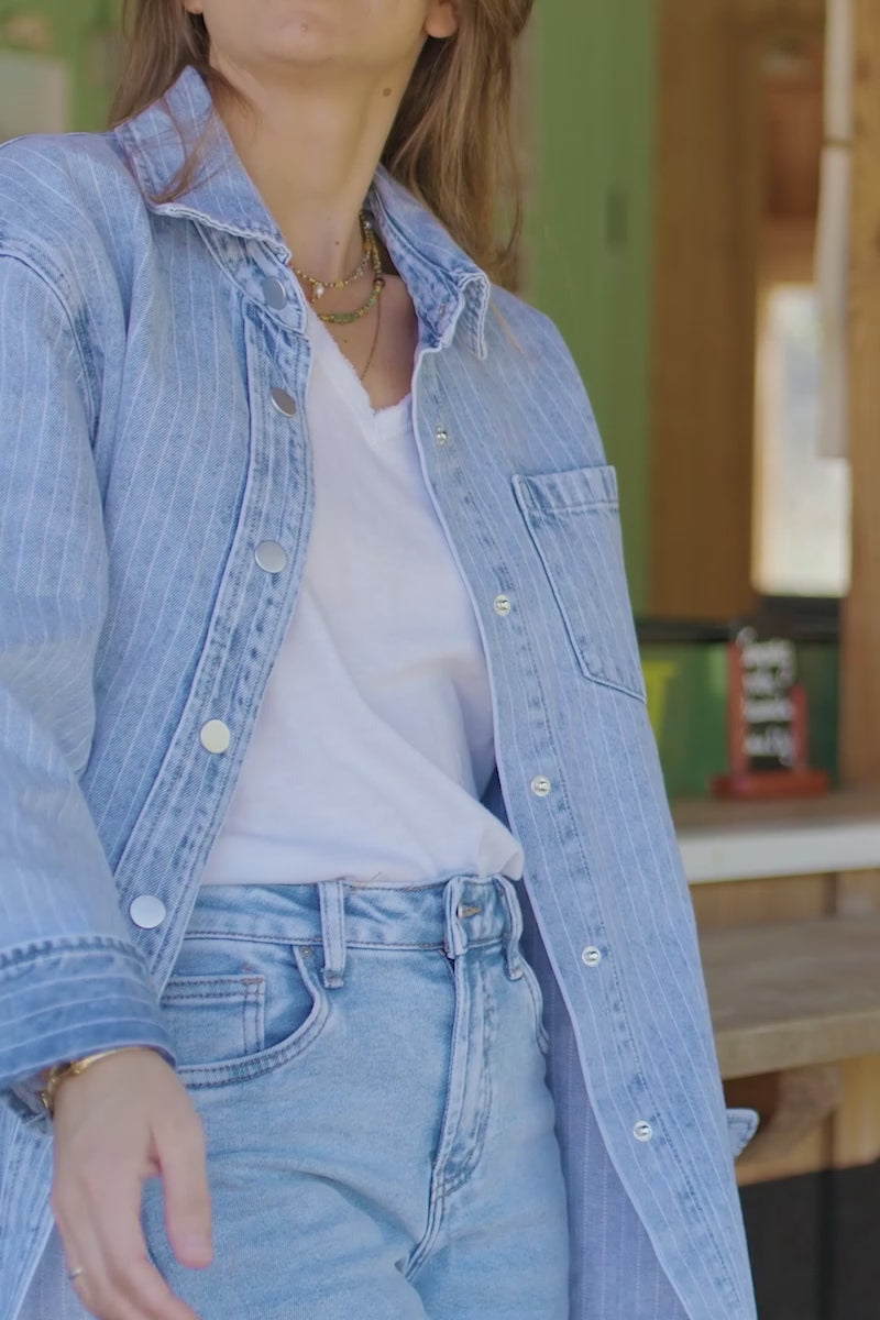 - Esta sobrecamisa de mezclilla lavada con sus finas rayas verticales blancas es la pieza perfecta para completar tus outfits con estilo.