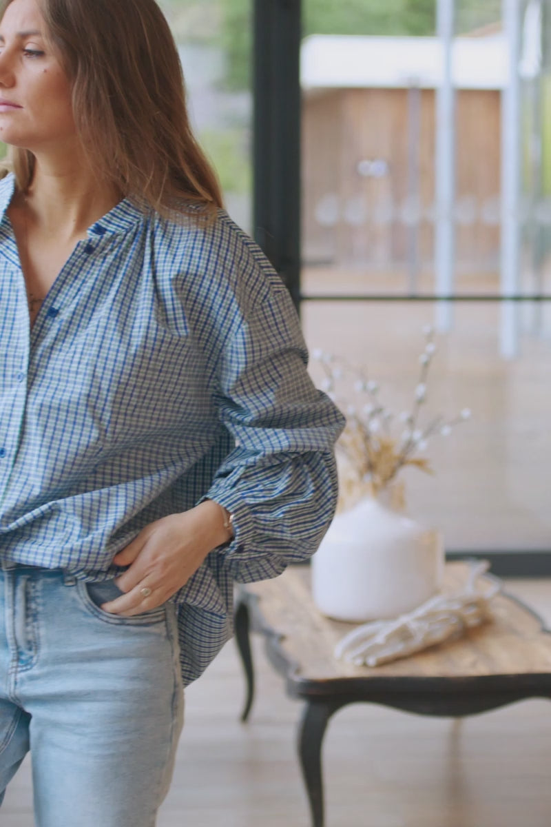 - Elegancia y sencillez definen esta túnica de algodón con sutiles cuadros azules y verdes.