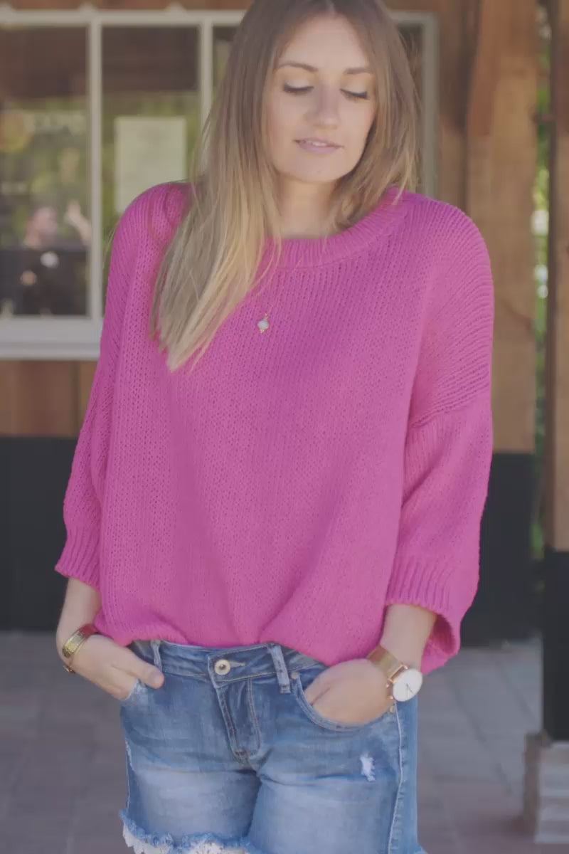 Jersey de punto grueso de algodón fucsia con manga murciélago y cuello redondo