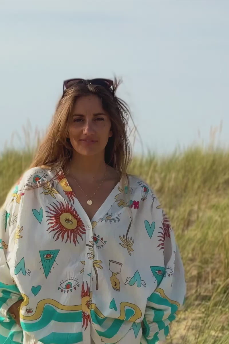- Son fond écru est sublimé par des symboles vibrants: soleils, yeux et cœurs dans de belles nuances turquoise, pour un esprit bohème et joyeux qui sent bon l’été.