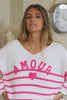 Pull en maille blanc cassé à rayures style marinière col v Amour bouclettes fuchsia