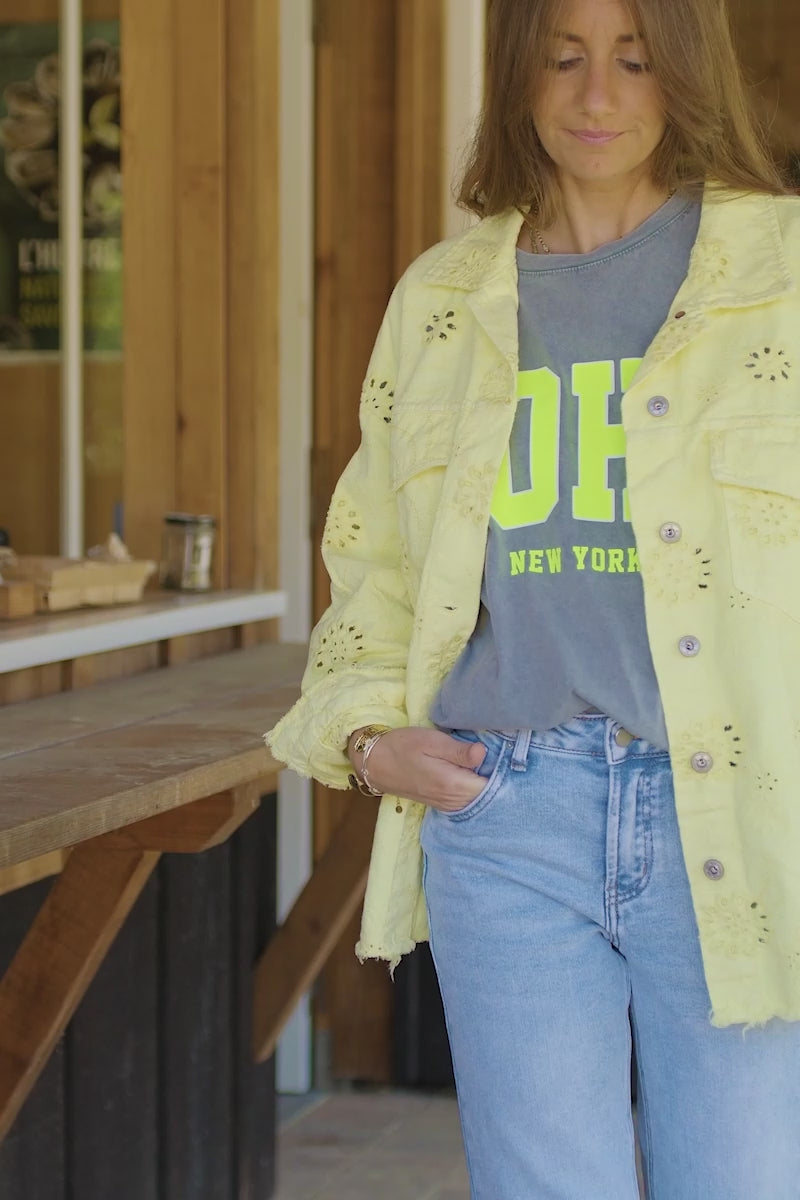 - Cette veste jaune en jean à la coupe loose se distingue par sa broderie en forme de fleur, un détail subtil mais élégant qui apporte une touche unique à votre look.