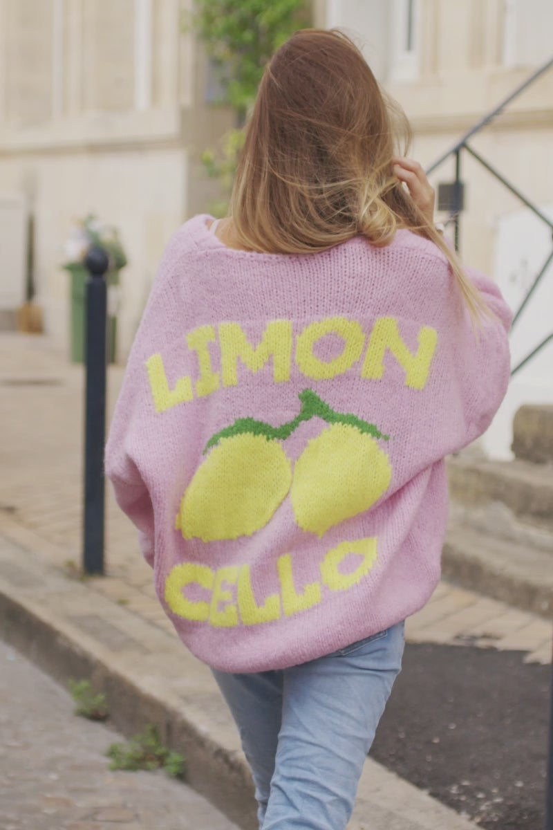 Gilet rose pâle en grosse maille et gros boutons citron limoncello au dos