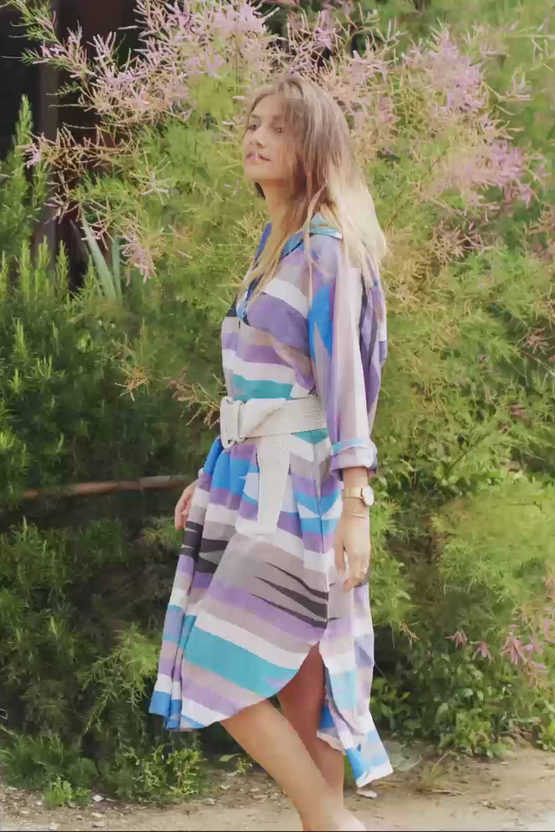 Robe mi longue à rayures aztèques bleu lilas coton effet piqué col chemise en v