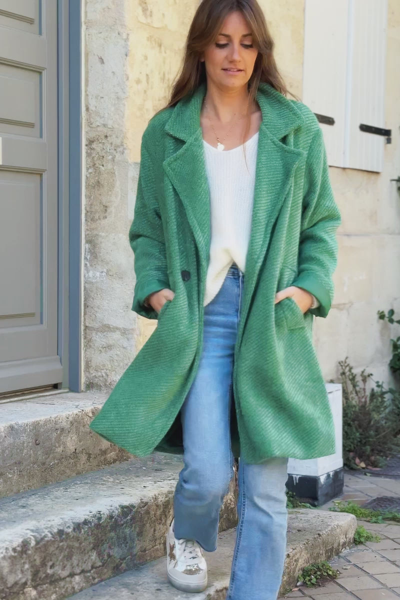 - Ce manteau long vert est la pièce idéale pour un look chic et décontracté.