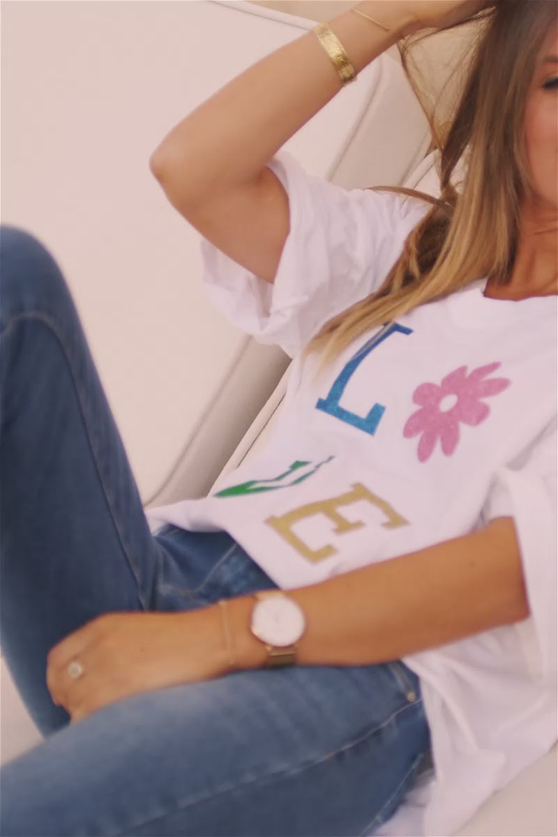 Tshirt large blanc en coton manches looses LOVE brillant fleurs