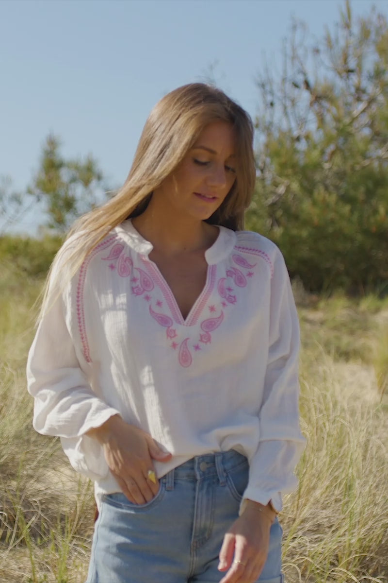 Blouse en gaze de coton blanc broderie cachemire rose col