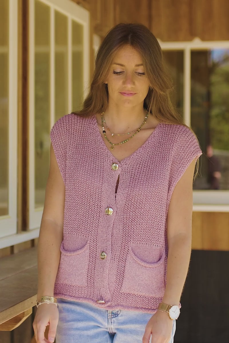 Gilet rose sans manches en maille lurex poches et boutons dorés