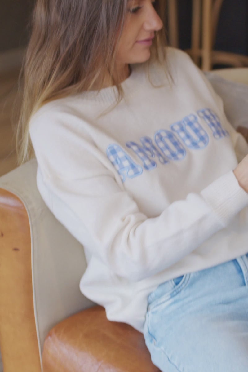 - Laissez-vous charmer par ce pull blanc cassé, où le mot "Amour" se dévoile à travers une broderie en carreaux vichy bleu sur le devant, ajoutant une touche douce et romantique à votre look.
