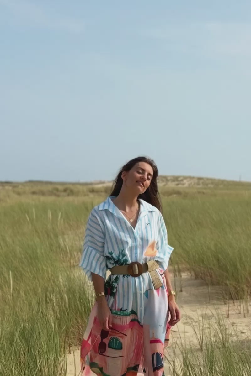Robe chemise longue et large blanche imprimé Italie pastel rayures bleues