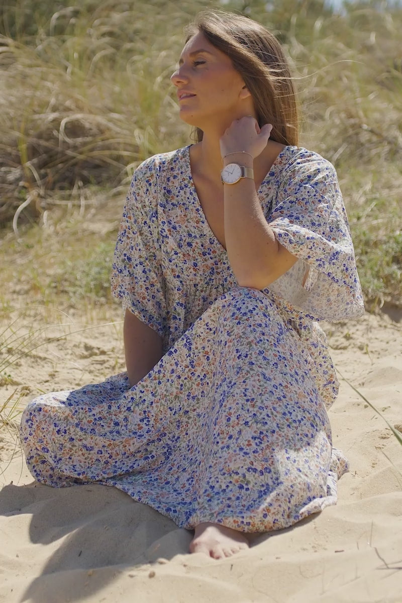 Robe longue fluide col V manches courtes imprimé liberty bleu roi